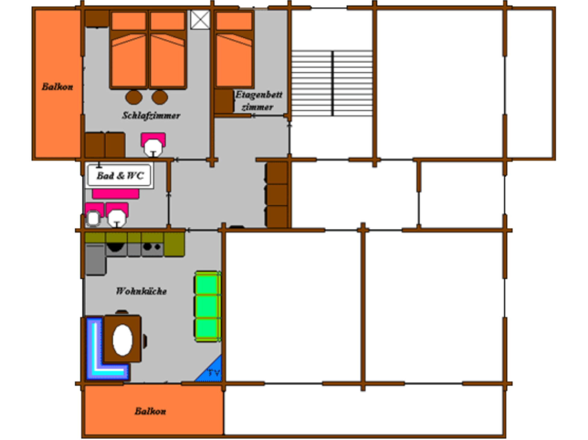 Die Wohnung befindet sich im zweiten Obergeschoss, besteht aus einer Wohnküche mit Sat - TV 1 Doppelschlafzimmer mit 2 Betten, 1 Zimmer mit Etagenbett für 2 Personen ,Bad, Dusche und WC.